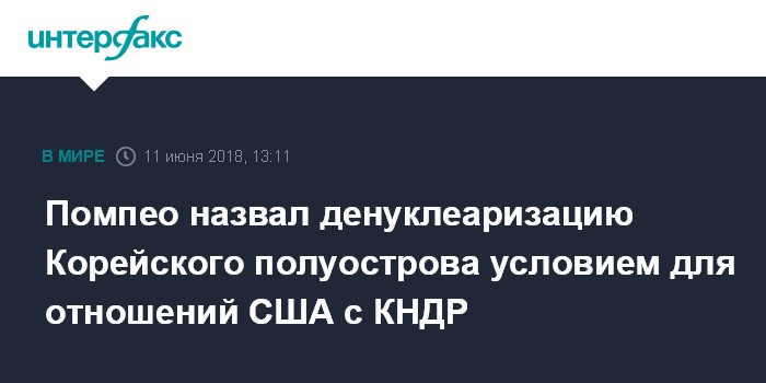 "Полная, достоверная и необратимая денуклеаризация Корейского полуострова - единственный результат, который примет США", - сказал он.