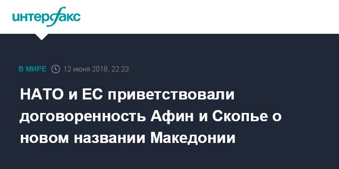 Москва. 12 июня. INTERFAX.RU - Генеральный секретарь НАТО Йенс Столтенберг и глава дипломатии ЕС Федерика Могерини выступили во вторник с заявлениями, в которых приветствуется соглашение между премьер-министрами Греции и Македонии Алексисом Ципрасом и Зораном Заевым по разрешению спора о названии бывшей югославской республики.