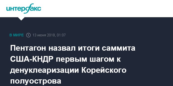 Москва. 13 июня. INTERFAX.RU - Итоги саммита лидеров США и КНДР Дональда Трампа и Ким Чен Ына в Сингапуре являются первым шагом на пути к полной и необратимой денуклеаризации Корейского полуострова, считают в Пентагоне.