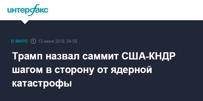 Москва. 13 июня. INTERFAX.RU - Договоренности, достигнутые на американо-северокорейском саммите в Сингапуре, позволили миру избежать ядерной катастрофы, заявил президент США Дональд Трамп.