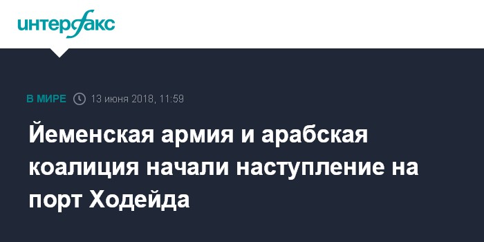 Москва. 13 июня. INTERFAX.RU - Армия Йемена при поддержке арабской коалиции начала в среду "полномасштабное наступление" на йеменский портовый город Ходейда, расположенный на берегу Красного моря, сообщает в среду межарабский телеканал "Аль-Арабийя".
