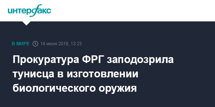 Москва. 14 июня. INTERFAX.RU - Пресс-служба Генпрокуратуры ФРГ сообщила в четверг, что подозревает гражданина Туниса в производстве биологического оружия.
