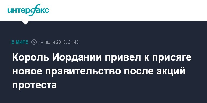 Москва. 14 июня. INTERFAX.RU - Правительство Иордании во главе с премьер-министром Умаром ар-Раззазом, сформированное после демонстраций против налоговой реформы и отставки предыдущего премьера, приведено к присяге, сообщила в четверг межарабская газета "Аш-Шарк Аль-Аусат".