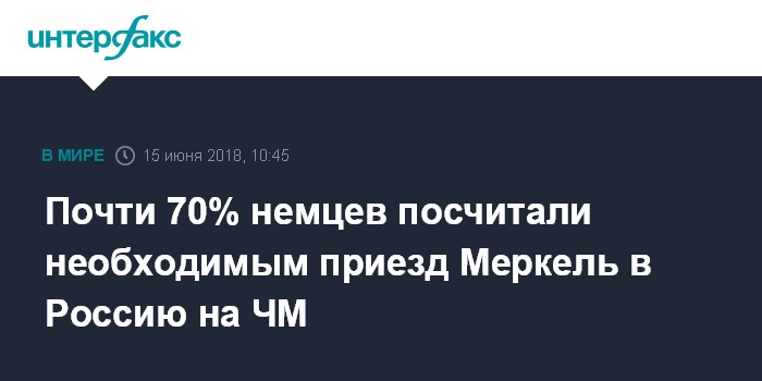 Москва. 15 июня. INTERFAX.RU - Большинство немцев считает, что со стороны канцлера Ангелы Меркель было бы неправильным остаться в стороне и не посетить Россию в дни проведения чемпионата мира по футболу.