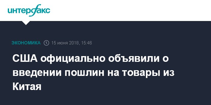 Москва. 15 июня. INTERFAX.RU - Власти США ввели дополнительные пошлины в размере 25% на 1,1 тыс. наименований китайских товаров на общую сумму примерно в $50 млрд, говорится в пресс-релизе Управления торгового представителя США.