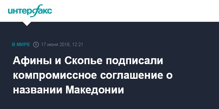 Москва. 17 июня. INTERFAX.RU - Главы греческого и македонского МИД, Никос Котзиас и Никола Димитров, подписали в воскресенье соглашение о новом официальном названии Македонии, сообщает агентство EFE.