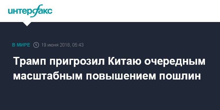 Москва. 19 июня. INTERFAX.RU - Президент США Дональд Трамп объявил, что готов обложить 10-процентными пошлинами импортируемые китайские товары на сумму $200 млрд, сообщил Белый дом.