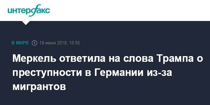 Москва. 19 июня. INTERFAX.RU - Канцлер ФРГ Ангела Меркель прокомментировала слова президента США Дональда Трампа, который написал в твиттере, что преступность в Германии выросла на 10% с момента появления в стране мигрантов, а немецкие власти "не хотят об этом говорить".