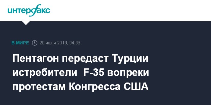 Москва. 20 июня. INTERFAX.RU - США в четверг передадут Турции первые истребители-бомбардировщики F-35, несмотря на противодействия со стороны американского Конгресса, сообщает телеканал CNN со ссылкой на Пентагон.