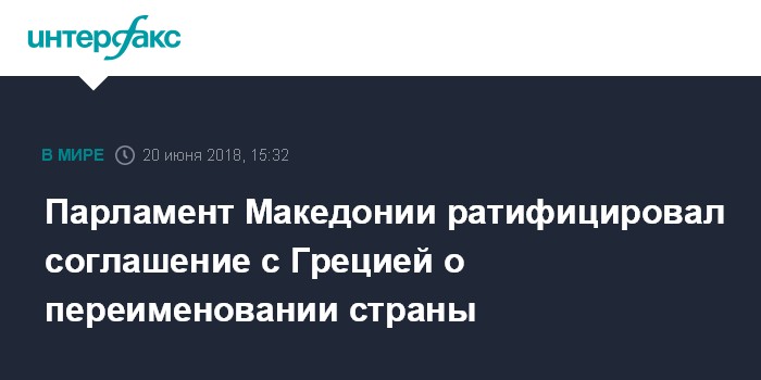 Москва. 20 июня. INTERFAX.RU - Парламент Македонии завершил процесс ратификации договоренности с Грецией о переименовании Македонии, сообщает в среду агентство Associated Press.