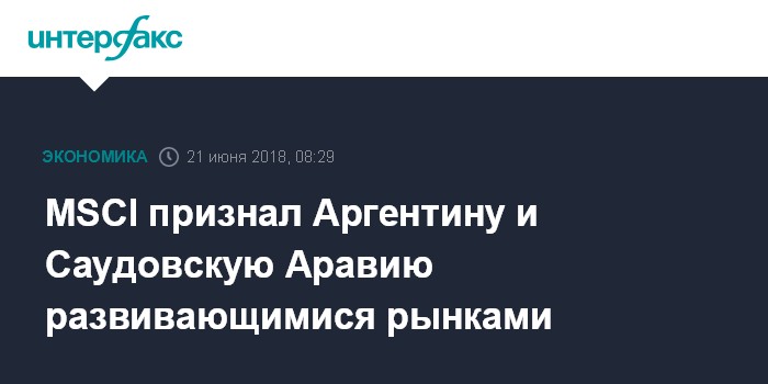 Москва. 21 июня. INTERFAX.RU - MSCI Inc., провайдер семейства популярных фондовых индексов, принял решение причислить Саудовскую Аравию и Аргентину к группе стран с формирующимся рынком (emerging markets).