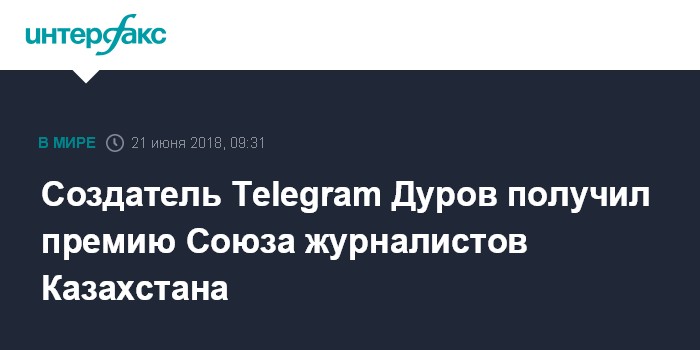 Москва. 21 июня. INTERFAX.RU - Союз журналистов Казахстана присудил премию за позицию против цензуры основателю социальной сети "ВКонтакте" и мессенджера Telegram Павлу Дурову, сообщается на сайте организации.