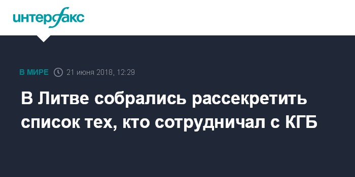 Москва. 21 июня. INTERFAX.RU - Сейм Литвы согласился на рассмотрение инициативы предать огласке фамилии бывших сотрудников КГБ, сделавших признание о сотрудничестве с этой организацией.