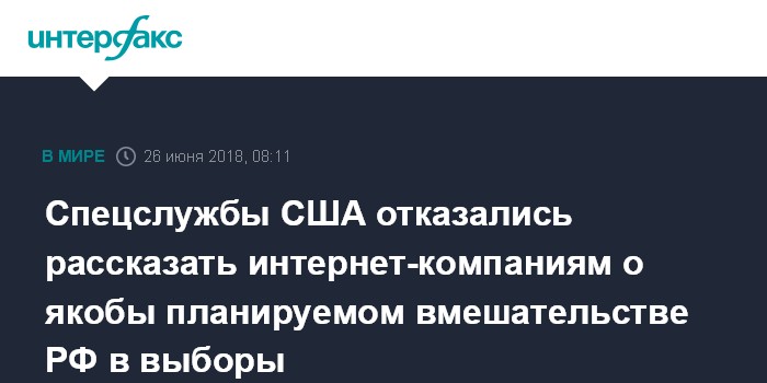 Москва. 26 июня. INTERFAX.RU - Представители ФБР и министерства внутренней безопасности США отказались представить крупнейшим интернет-компаниям сведения о том, как Россия собирается вмешиваться в предстоящие промежуточные выборы, сообщила газета New York Times.