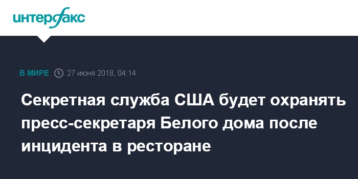 Москва. 27 июня. INTERFAX.RU - Пресс-секретаря Белого дома Сару Сандерс будет охранять Секретная служба США после того, как ее отказались обслуживать в одном из ресторанов, сообщил телеканал CNN со ссылкой на источники.