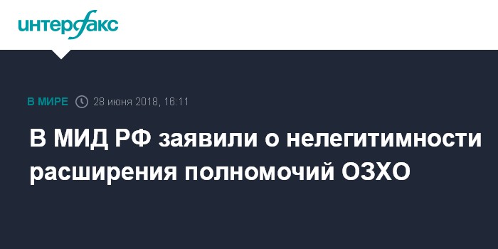 Москва. 28 июня. INTERFAX.RU - В МИД РФ считают нелегитимным и незаконным решение, наделяющее Технический секретариат Организации по запрещению химического оружия (ОЗХО) полномочиями по установлению виновных в применении химоружия в Сирии.