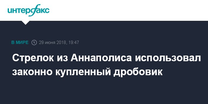 Москва. 29 июня. INTERFAX.RU - Мужчина, убивших пятерых человек в редакции газеты The Capital Gazette в американском городе Аннаполисе в штате Мэриленд, использовал законно приобретенный дробовик, сообщает в пятницу CBS News со ссылкой на местную полицию.