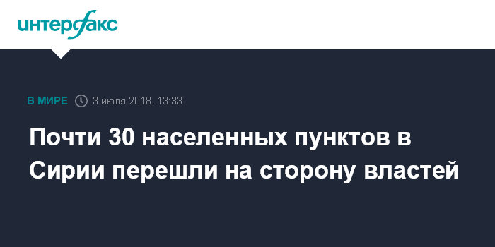 Москва. 3 июля. INTERFAX.RU - Почти 30 сирийских населенных пунктов в южной зоне деэскалации перешли на сторону правительства САР, сообщили во вторник в российском Центре примирения враждующих сторон в Сирии.