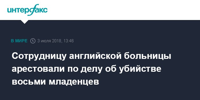 Москва. 3 июля. INTERFAX.RU - Сотрудницу больницы в английском Честере (Countess of Chester Hospital) арестовали по подозрению в убийстве восьми младенцев и покушении на убийство еще шести, сообщает "Би-би-си".