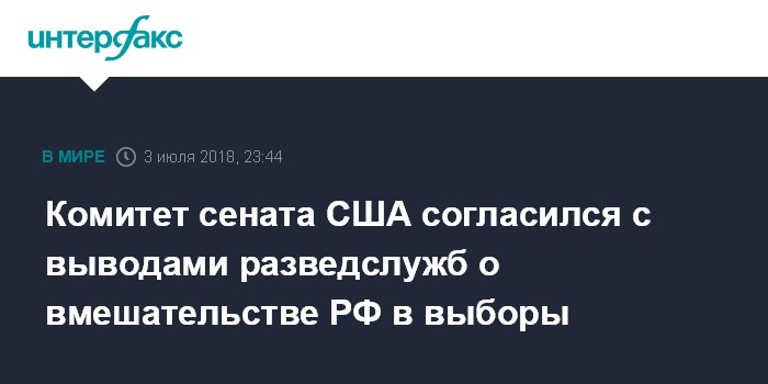 Москва. 3 июля. INTERFAX.RU - Комитет сената конгресса США по разведке во вторник поддержал сделанные в 2017 году выводы разведслужб о том, что Россия якобы вмешивалась в президентские выборы 2016 года и продолжает прилагать усилия с целью подрыва демократии в США. Во вторник комитет опубликовал несекретный отчет комитета с предварительными выводами по докладу ЦРУ и АНБ от января 2017 года.