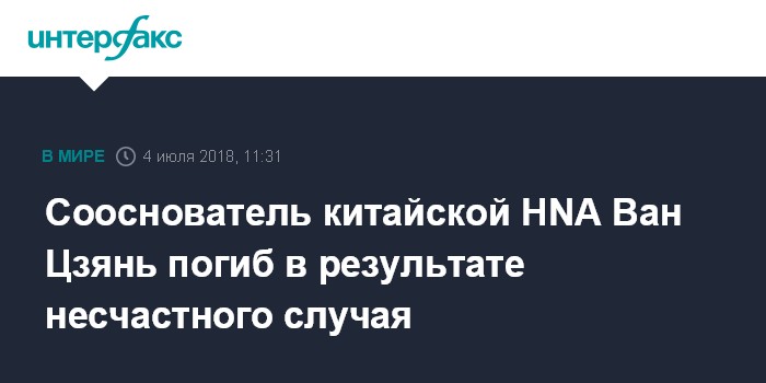 Москва. 4 июля. INTERFAX.RU - Сооснователь и председатель совета директоров китайского конгломерата HNA Group Co. Ван Цзянь погиб в результате несчастного случая во французском Провансе, где находился в деловой поездке.