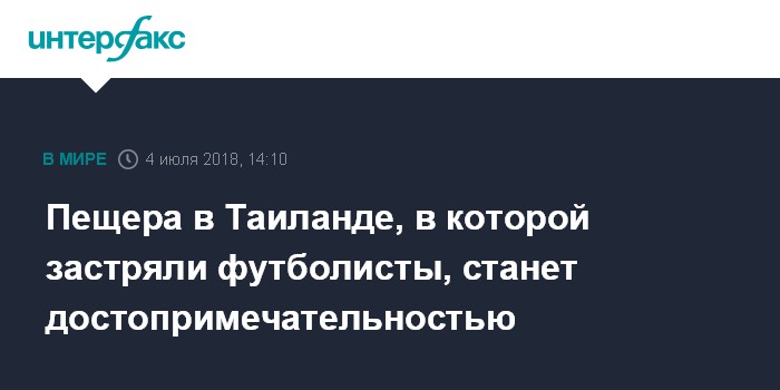 Москва. 4 июля. INTERFAX.RU - Пещера Tham Luang в Таиланде, из которой спасатели готовятся эвакуировать 12 игроков местной футбольной команды и их тренера, станет достопримечательностью, пишет в среду The Bangkok Post.