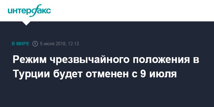 Москва. 5 июля. INTERFAX.RU - Премьер-министр Турции Бинали Йылдырым в четверг заявил, что режим чрезвычайного положения в Турции, введенный летом 2016 года после попытки госпереворота, будет отменен в понедельник 9 июля после того, как будет утвержден новый состав кабинета министров, сообщает агентство "Анадолу".