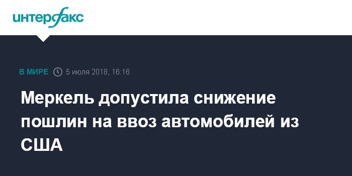 Москва. 5 июля. INTERFAX.RU - Канцлер ФРГ Ангела Меркель в четверг заявила, что не исключает рассмотрения в ЕС снижения пошлин на импорт автомобилей из США.