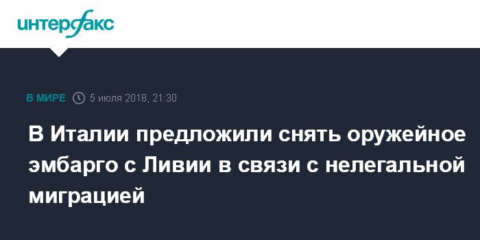 Москва. 5 июля. INTERFAX.RU - Власти Италии хотели бы отмены оружейного эмбарго ООН в отношении Ливии, чтобы ливийские власти смогли более эффективно бороться с нелегальной иммиграцией в Европу, заявил в четверг глава итальянского МВД Маттео Сальвини.