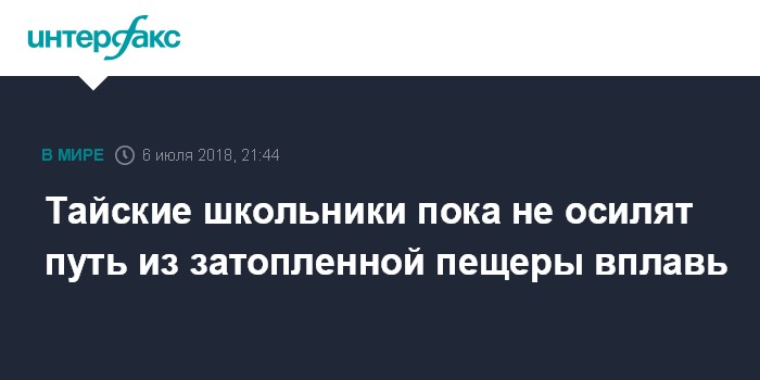 Москва. 6 июля. INTERFAX.RU - Участники школьной футбольной команды, оказавшимся в ловушке в одной из пещер в Таиланде вместе с тренером, могут ходить, но им не хватит сил плыть под водой, сообщает в пятницу сайт канала Би-би-си со ссылкой на губернатора провинции губернатор провинции Чианг Рай Наронгсака Оссатанакорна.