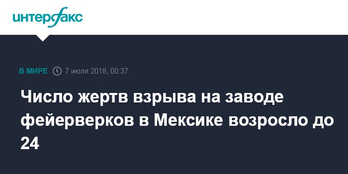 Москва. 7 июля. INTERFAX.RU - В результате взрывов на заводе по производству фейерверков в пригороде Мехико погибли 24 человека, в том числе четверо пожарных, сообщает в пятницу информагентство Associated Press.