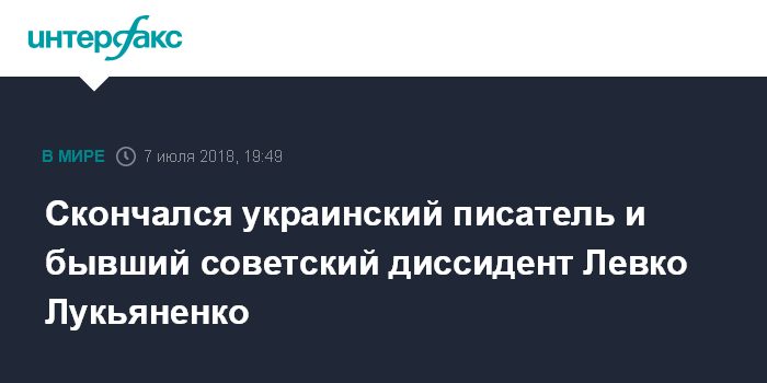 Москва. 7 июля. INTERFAX.RU - Украинский писатель, правозащитник и бывший народный депутат Украины Левко Лукьяненко скончался в субботу, 7 июля, сообщил премьер-министр Украины Владимир Гройсман.