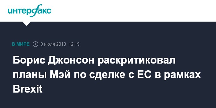 Москва. 8 июля. INTERFAX.RU - Глава МИД Великобритании Борис Джонсон раскритиковал планы премьер-министра страны Терезы Мэй по таможенным отношениям с ЕС, сообщает телеканал "Би-би-си".