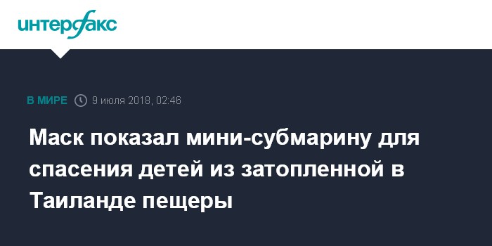 Москва. 9 июля. INTERFAX.RU - Глава SpaceX и Tesla Илон Маск опубликовал видео испытаний мини-субмарины, которую он предложил использовать для спасения детей, оказавшихся заблокированными в затопленной пещере на севере Таиланда.