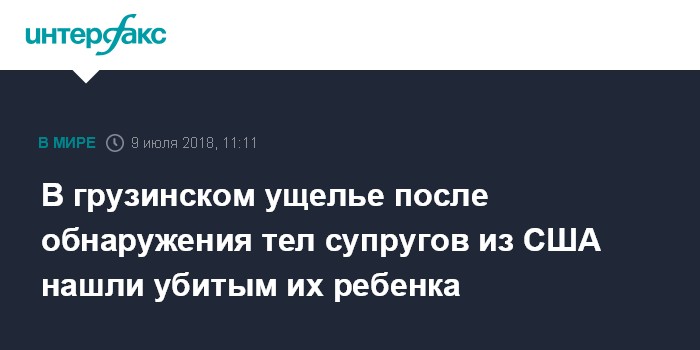 Москва. 9 июля. INTERFAX.RU - Четырехлетний ребенок четы из США, которого несколько дней искали в ущелье Хада в грузинском регионе Мцхета-Мтианети, найден мертвым, предполагается, что было совершено убийство, сообщил в понедельник Первому каналу Общественного вещателя Грузии глава районной администрации Душети Зураб Сехниашвили.