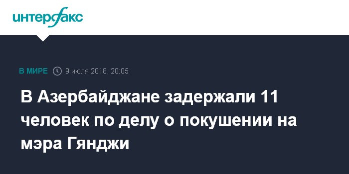Москва. 9 июля. INTERFAX.RU - Правоохранительные органы Азербайджана задержали 11 человек по уголовному делу в рамках покушения на главу исполнительной власти Гянджи (второй по величине город страны) Эльмара Велиева.