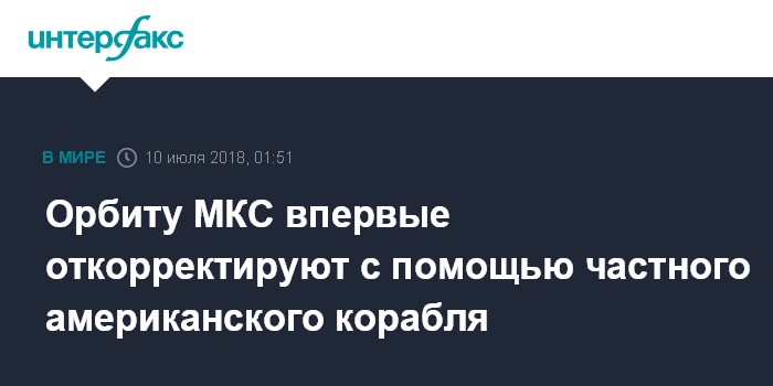 Москва. 10 июля. INTERFAX.RU - Частный американский космический грузовик во вторник впервые в истории "приподнимет" орбиту Международной космической станции, сообщил "Интерфаксу" источник в ракетно-космической отрасли.