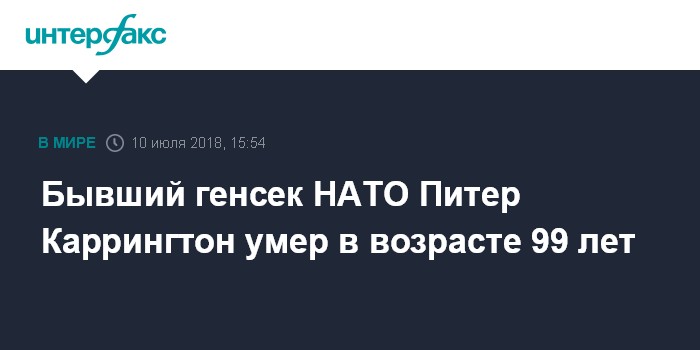 Москва. 10 июля. INTERFAX.RU - В Великобритании в возрасте 99 лет скончался бывший министр иностранных дел лорд Питер Каррингтон, возглавлявший МИД при премьер-министре Маргарет Тетчер в 1979-1982 гг., сообщает во вторник телеканал Sky News.