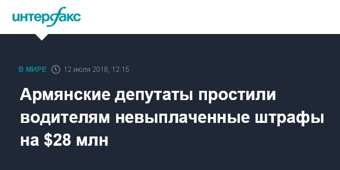 Москва. 12 июля. INTERFAX.RU - Парламент Армении на заседании в четверг принял законопроект об амнистии неуплаченных водителями штрафов за нарушение правил дорожного движения в период с 1 января 2012 года по 31 декабря 2017 года.