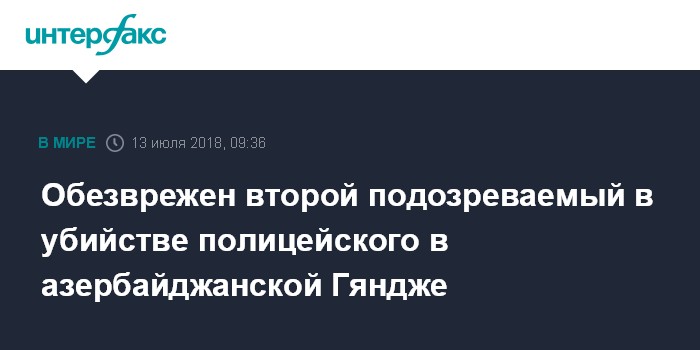 Москва. 13 июля. INTERFAX.RU - Правоохранительные органы Азербайджана обезвредили подозреваемого в убийстве одного из офицеров полиции в Гяндже - втором по величине городе страны, сообщают местные СМИ.