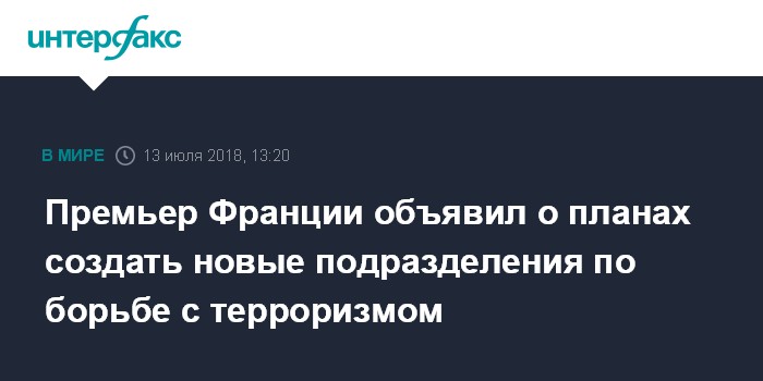 Москва. 13 июля. INTERFAX.RU - Премьер-министр Франции Эдуар Филипп в пятницу обнародовал план по усилению борьбы с терроризмом в стране, пояснив, что планируется, в частности, формирование новых контртеррористических подразделений, передает в пятницу агентство АР.