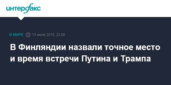 Москва. 13 июля. INTERFAX.RU - Президенты России и США Владимир Путин и Дональд Трамп встретятся в Хельсинки в понедельник, 16 июля около 13:00 в Президентском дворце, сообщила в пятницу канцелярия президента Финляндии.