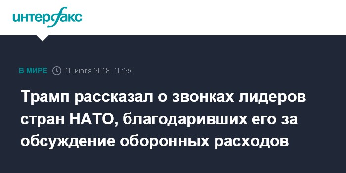 "Я получил множество звонков от лидеров государств-членов НАТО, которые поблагодарили меня за то, что я их собрал для обсуждения финансовых обязательств - на сегодняшний день и в перспективе", - написал Трамп в твиттере.