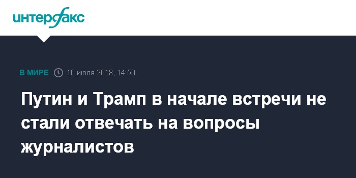 Москва. 16 июля. INTERFAX.RU - Президенты России и США Владимир Путин и Дональд Трамп начали переговоры с обмена краткими приветствиями. При этом лидеры двух стран, несмотря на попытки журналистов задать им вопросы прямо в начале встречи, оставили эти вопросы без ответа.