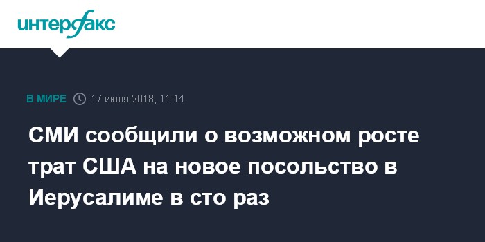 Москва. 17 июля. INTERFAX.RU - Строительство посольства США в Иерусалиме обойдется в сто раз дороже, чем заявлял президент Дональд Трамп, пишет во вторник The Times Of Israel.