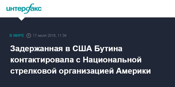 Москва. 17 июля. INTERFAX.RU - Задержанная в США по подозрению в шпионаже гражданка РФ Мария Бутина ранее контактировала с Национальной стрелковой организацией Америки (NRA), заявил "Интерфаксу" председатель правления всероссийской организации "Право на оружие" Игорь Шмелев.