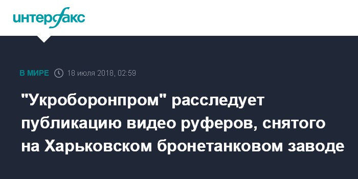 Москва. 18 июля. INTERFAX.RU - ГК "Укроборонпром" сообщил, что проводит расследование состояния охраны периметра предприятия после публикации в Youtube видео, снятого местными руферами на территории Харьковского бронетанкового завода.