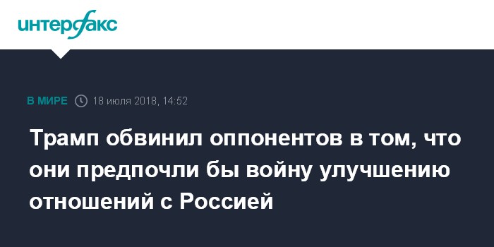 Москва. 18 июля. INTERFAX.RU - Президент США Дональд Трамп в среду обвинил своих оппонентов в том, что они предпочли бы войну улучшению отношений с Россией.