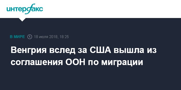 Москва. 18 июля. INTERFAX.RU - Министр иностранных дел Венгрии Петер Сийярто в среду заявил, что венгерское правительство приняло решение о выходе из международной сделки по миграции, из которой США вышли в конце 2017 года.