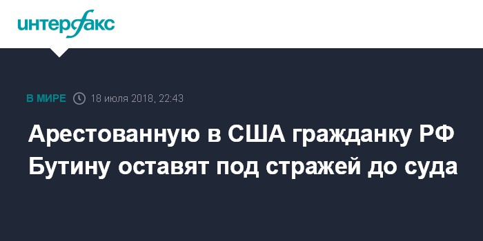 Москва. 18 июля. INTERFAX.RU - Федеральный судья США постановил в среду, что россиянка Мария Бутина останется под стражей вплоть до начала судебного разбирательства по ее делу, передает Национальное общественное радио США.